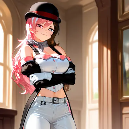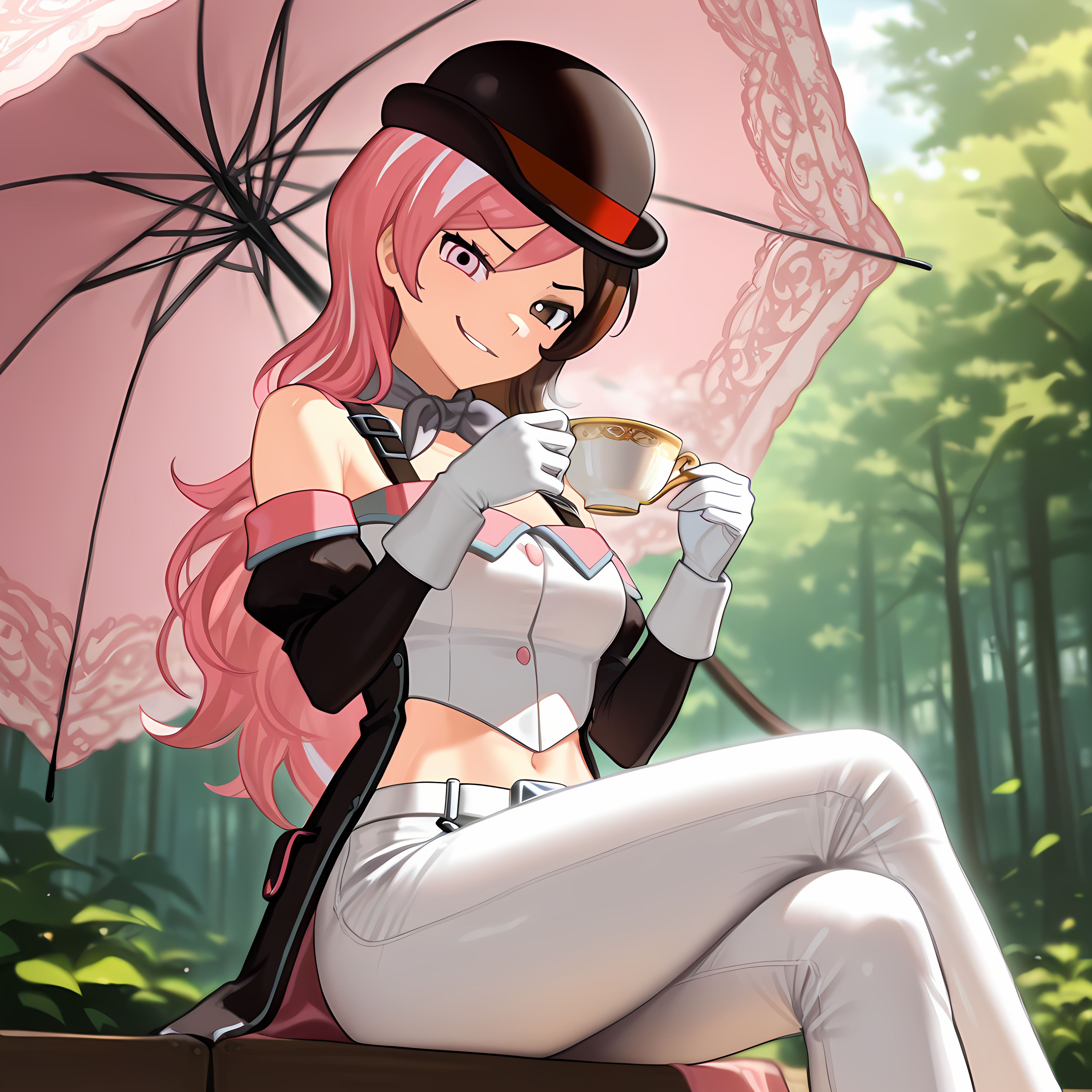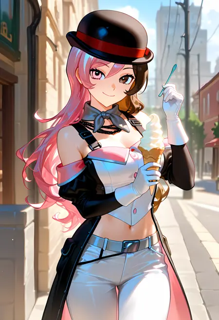 Atlas Outfit: N30_4tl4s, bowler hat, suspenders, grey scarf, white belt, white pants, white gloves, crop top, bare shoulders, detached sleeves, black coat, midriff
