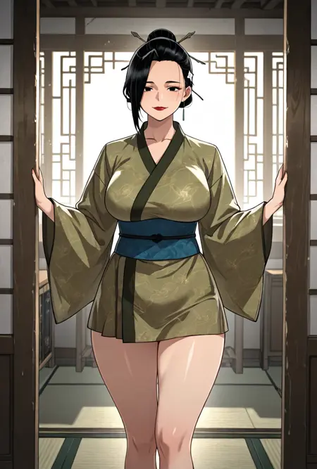 lin_yanqing, mature female, black eyes, black hair, hair pulled back, hair ornament, hair bun, hair stick, red lips, green kimono, blue obi,