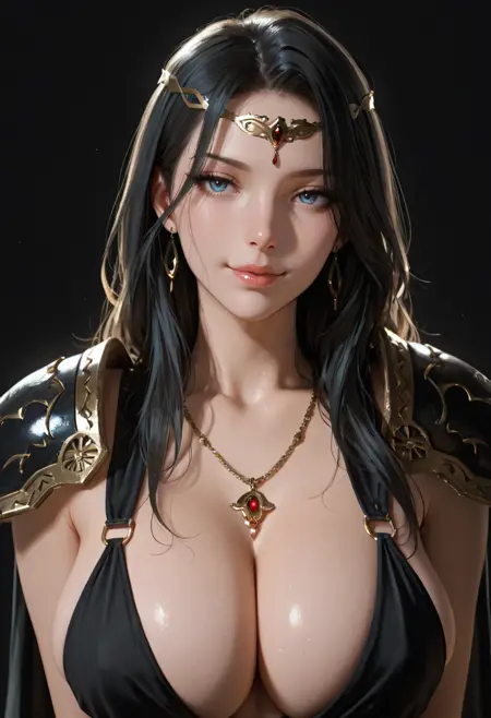 ot5, 1girl, breasts, solo, jewelry, necklace, cleavage, staff, long hair, shoulder armor, blue eyes, looking at viewer, black hair, armor, circlet, large breasts, black dress, upper body, black background, pauldrons, lips, realistic, dress, closed mouth
