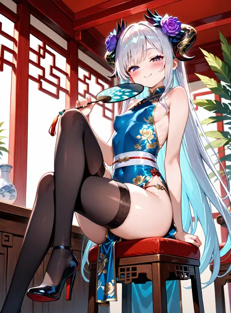 chinese shirt, side slit miniskirt,靴下/袜子/thighhighs: