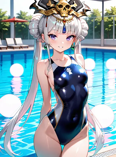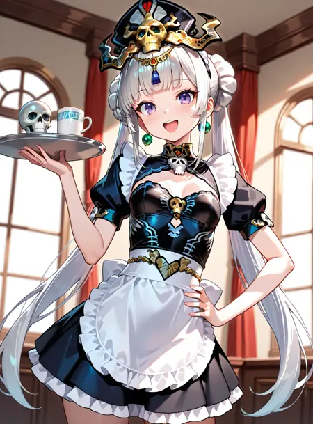 double bun twintails, skull headpiece, orb earrings,服/衣服/clothing: