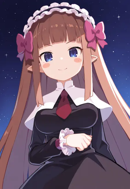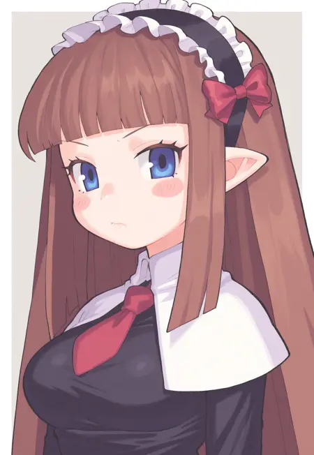 标签:D1MageWi, 1girl, solo, 蓝眼睛, 棕色头发, 长发, 直发, 齐刘海, 侧发, 花边发带, 带蝴蝶结的发带, 尖耳朵, 黑色连衣裙, A字裙, 长袖, 花边袖口, 小斗篷, 白色小斗篷, 红色领带, 领结, 裙摆外扩, 花边裙边, 红色短裤, 红色鞋子, 厚底玛丽珍鞋, 白色连裤袜, 哥特风, 丰满胸部, 脸颊红晕贴纸