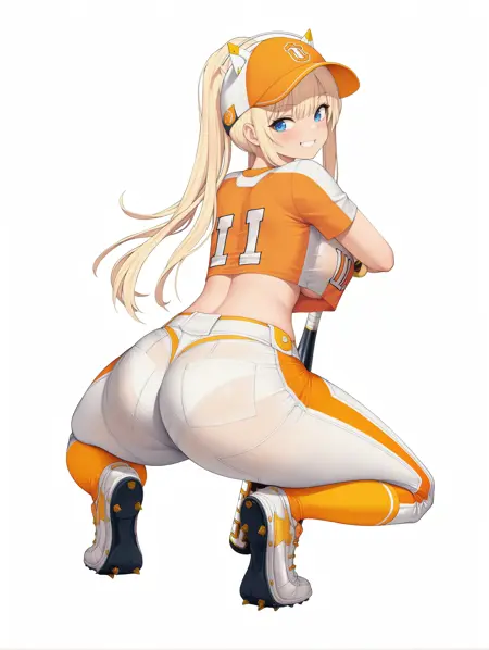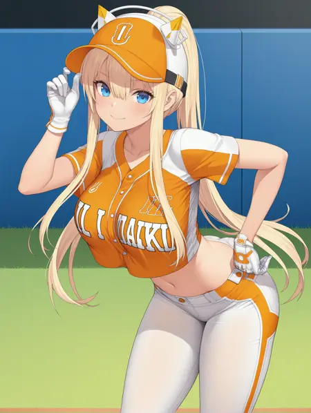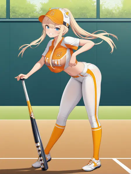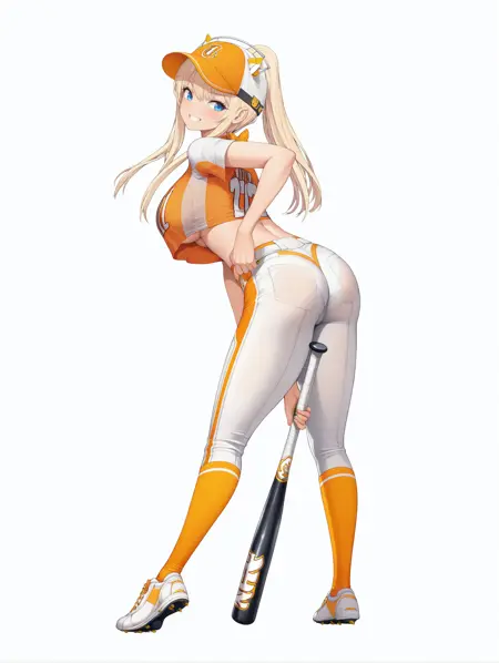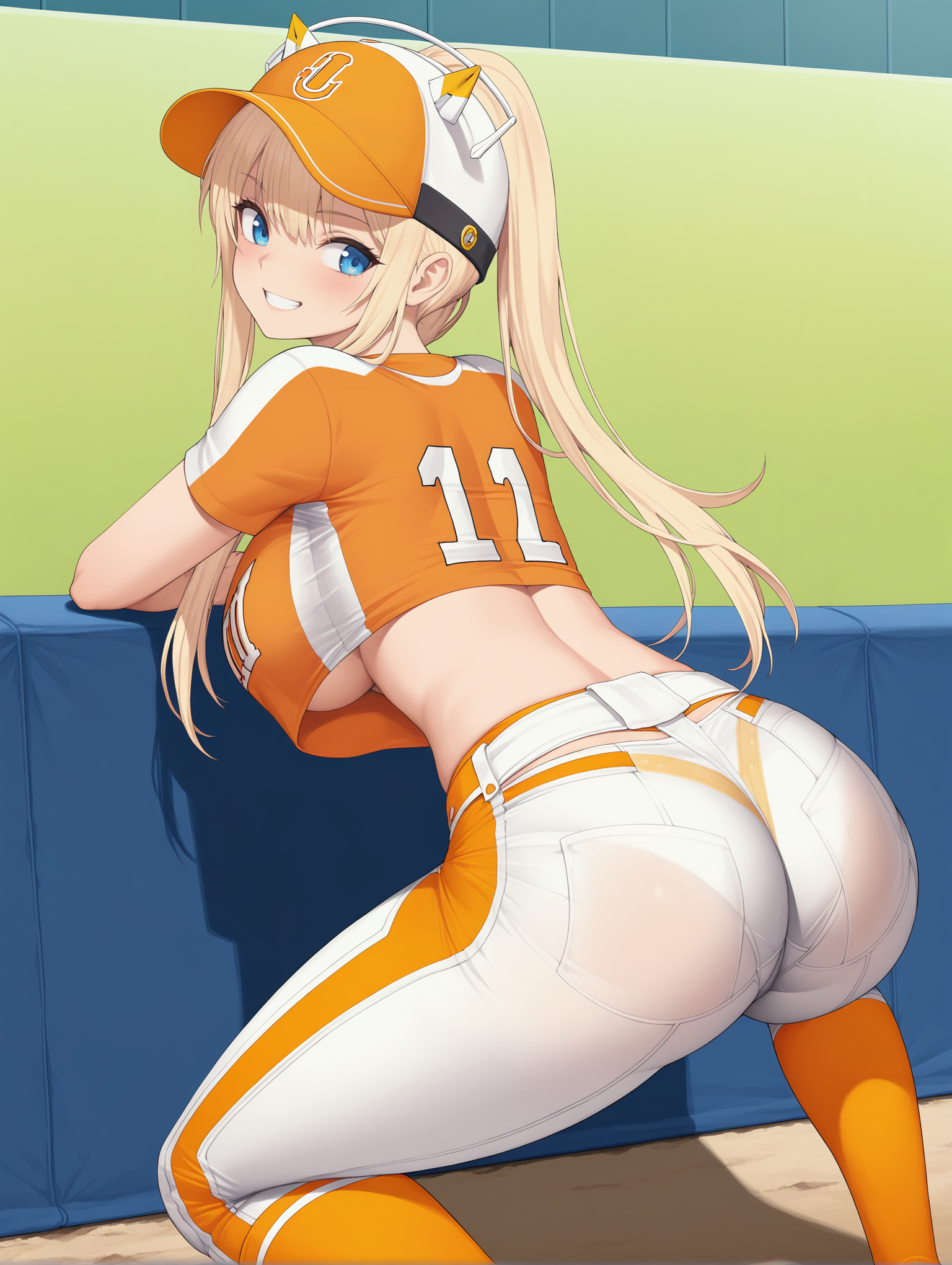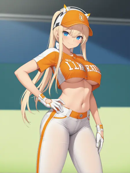 IL_Tove Baseball Fan,1girl,solo,blonde hair,blue eyes,pants,long hair,sidelocks,white pants,twintails,ponytail,breasts,large breasts