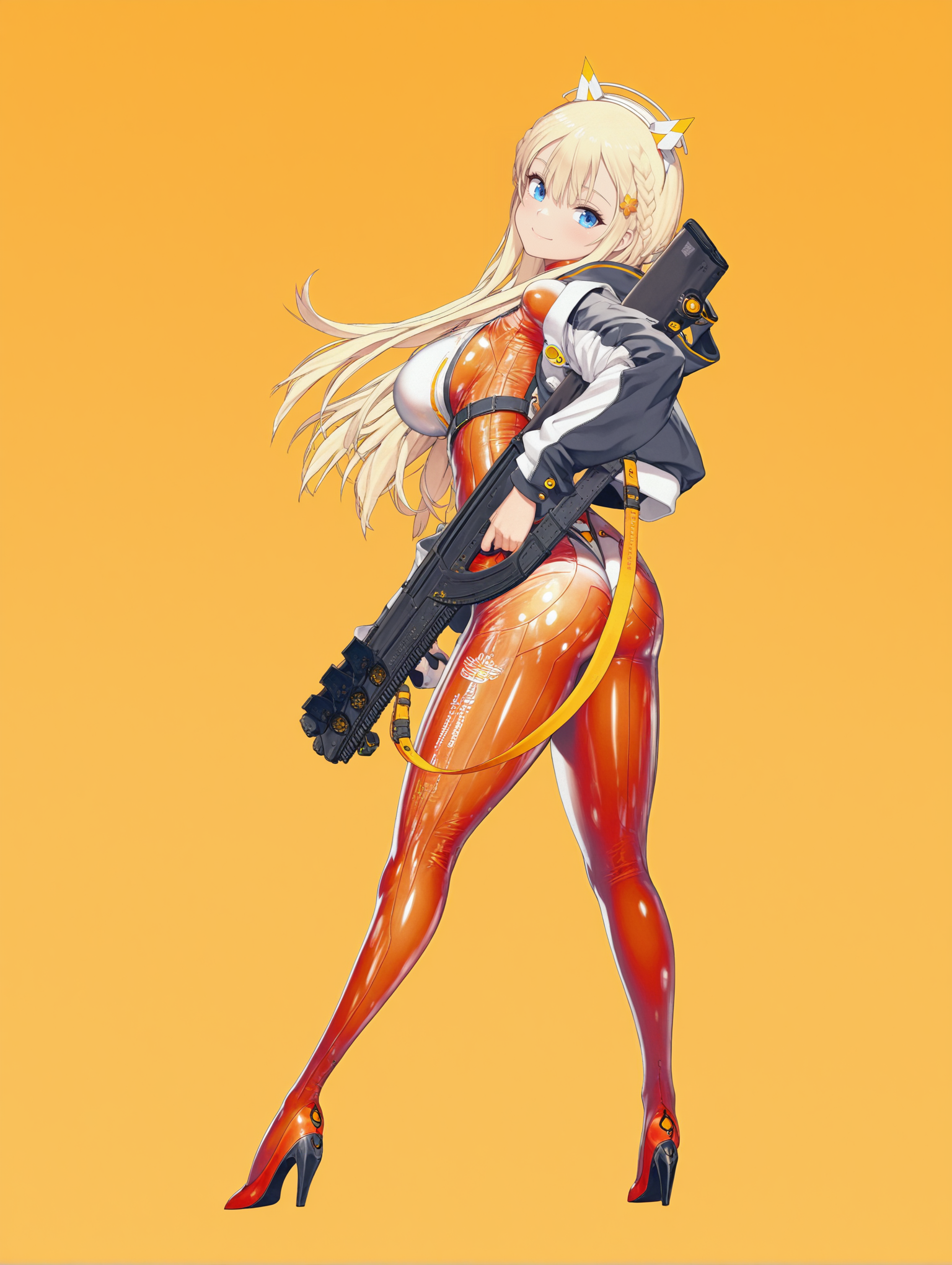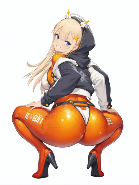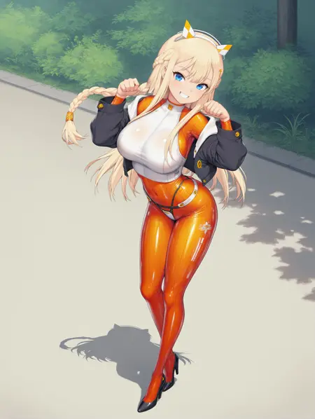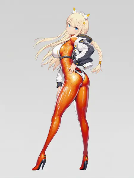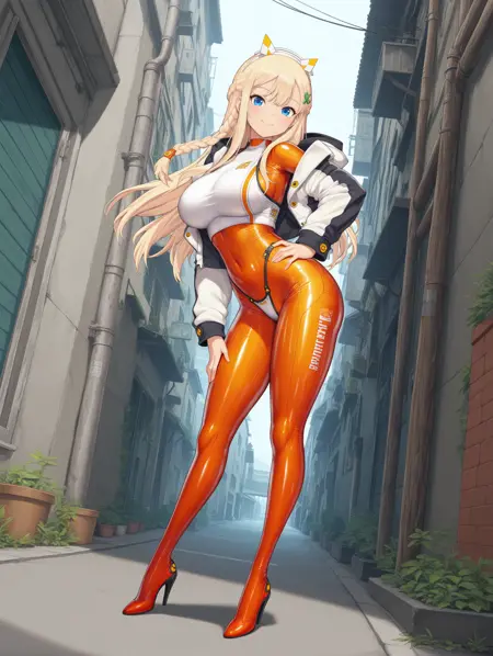 bodysuit,orange bodysuit,high heels,skin tight,shiny clothes,hood,hooded jacket,hoodie jacket,hairband,hair ornament,fake animal ears,white shirt,crop top,cropped jacket,jacket,covered navel,thong