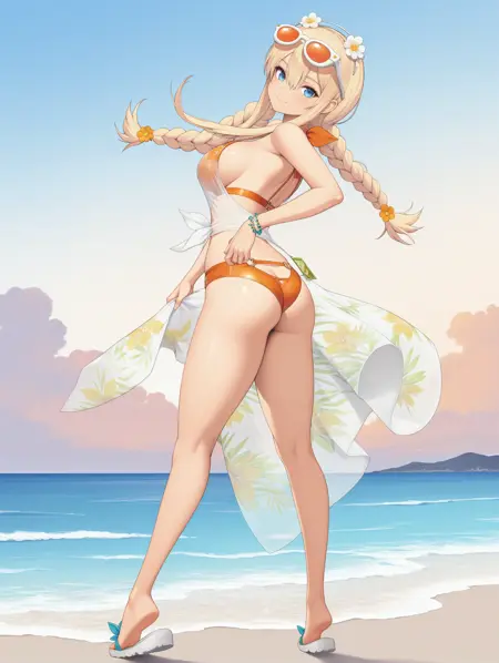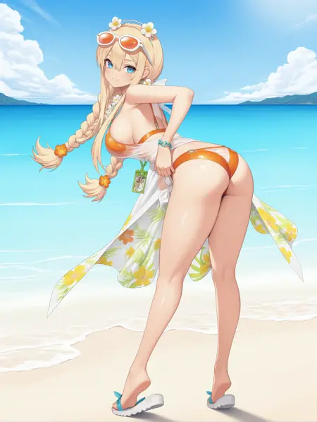 official alternate costume,swimsuit,eyewear on head,bikini,sandals,sunglasses,hair ornament,flower,hair flower,orange bikini,see-through,legs,sideboob,hairband,thighs,bracelet,floral print,bare shoulders,swimsuit cover-up,name badge,feet