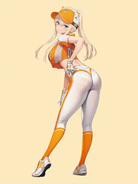 official alternate costume,visor cap,tight pants,crop top,hat,shirt,tight clothes,underwear,short sleeves,pantylines,shoes,white footwear,baseball cap,panties,cropped shirt,midriff,clothes writing,see-through,sportswear,baseball uniform,orange shirt,crop top overhang,underboob,navel