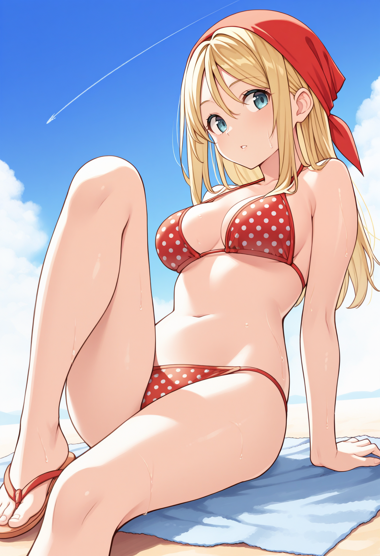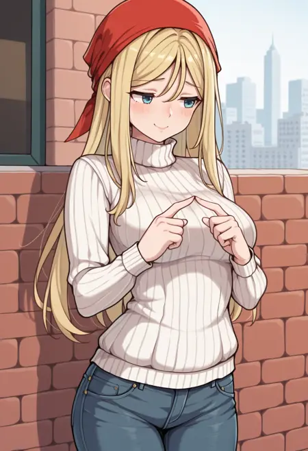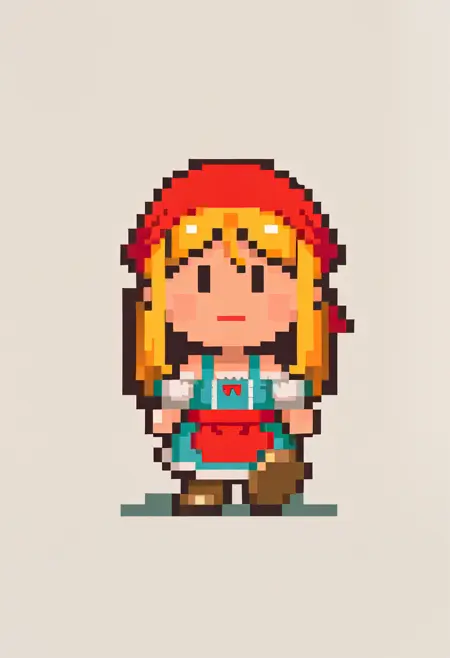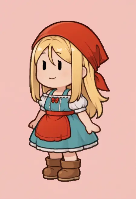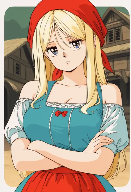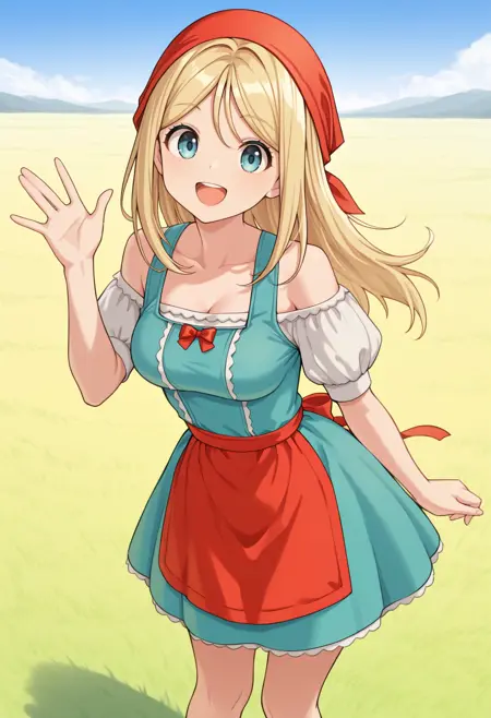 금발, 긴 머리, 빨간 머리수건, 눈 사이의 머리, 파란 눈, 아쿠아색 드레스, 어깨 드레스, 드러난 어깨, 중간 크기의 가슴, 빨간 리ボン, 푸석한 짧은 소매, 허리 앞치마, 빨간 앞치마, 무릎 부츠, 끈 매는 부츠, 갈색 신발