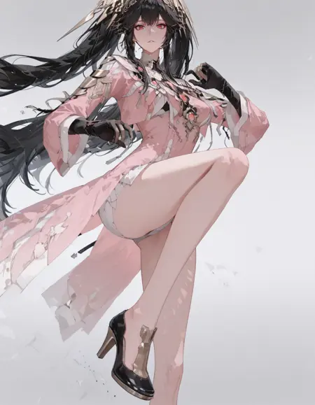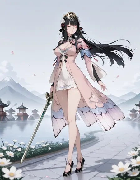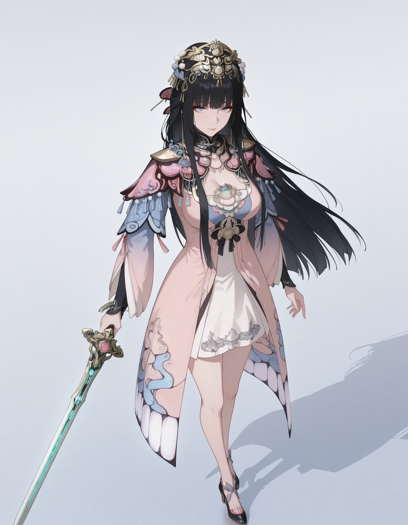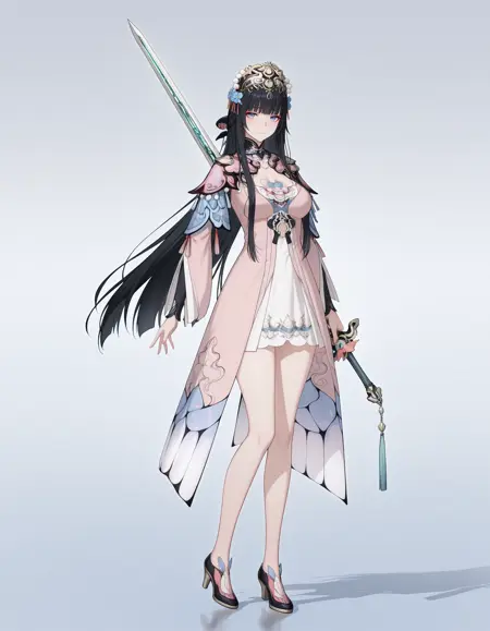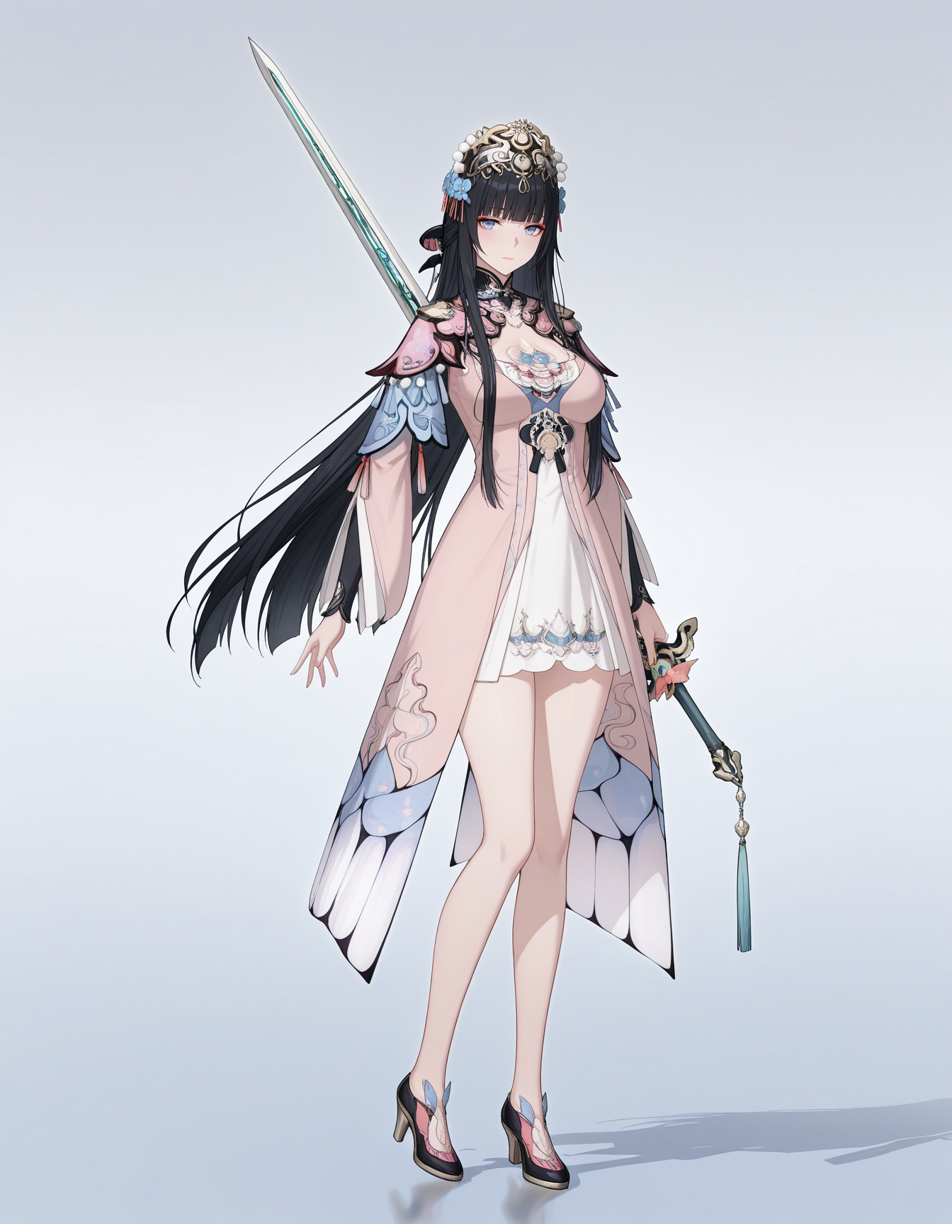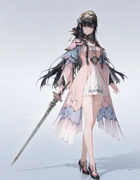 1girl,mai_pgr_qu_lysh,mature female,(age_up:2) very_long_hair,black_hair,long_sleeves,headdress,hair_ornament,pink_dress,blunt_bangs,bare_legs,high_heels,holding_great_sword