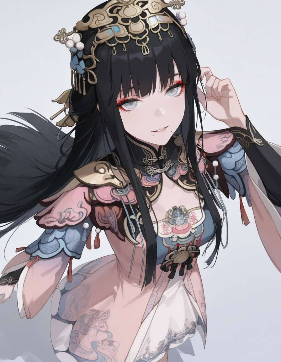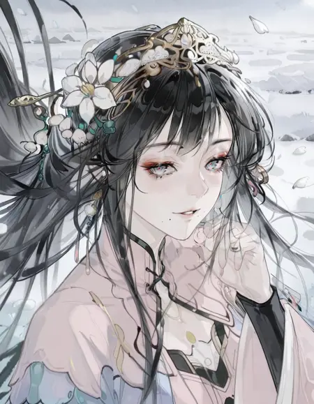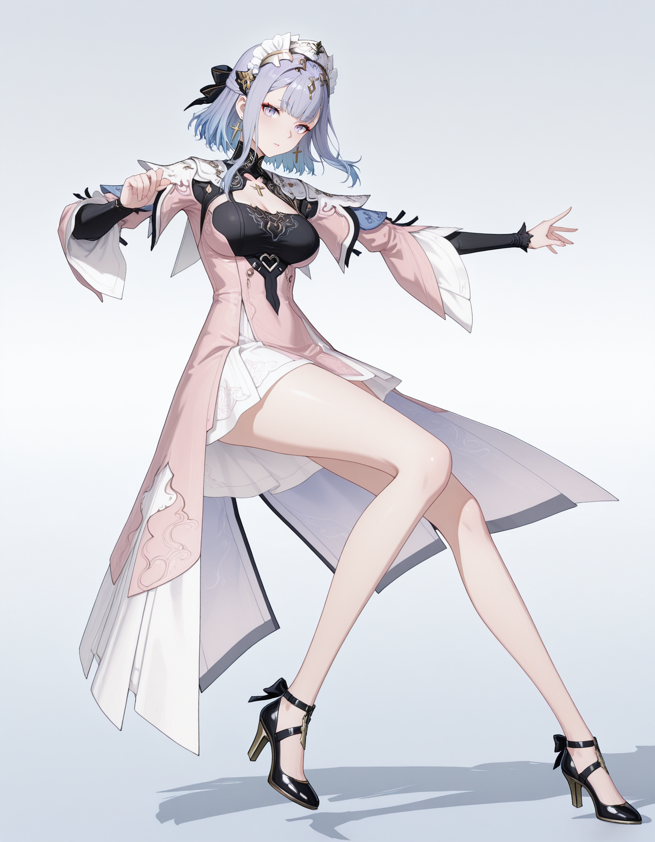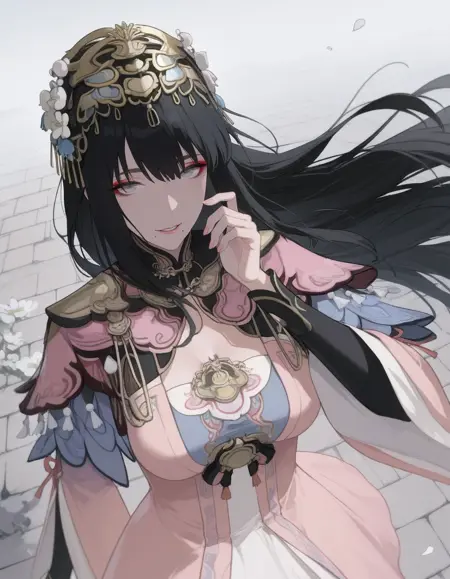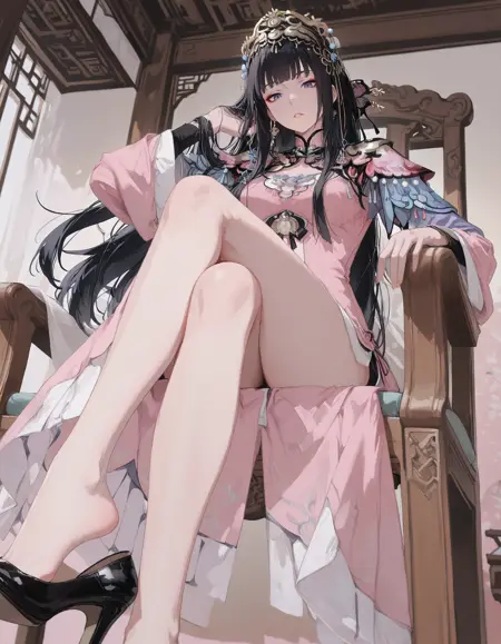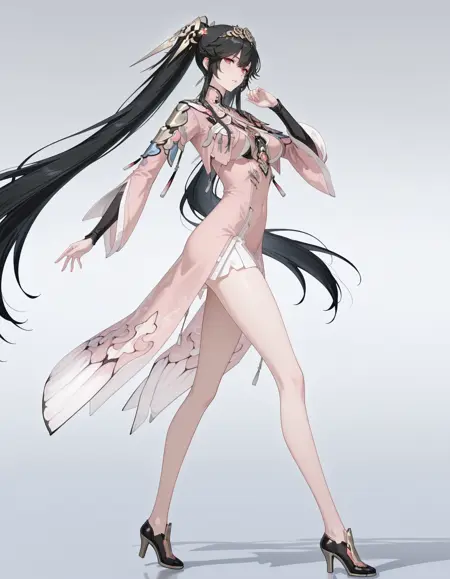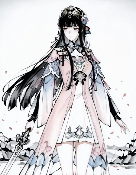 1girl,mai_pgr_qu_lysh,mature female,(age_up:2) very_long_hair,black_hair,long_sleeves,headdress,hair_ornament,pink_dress,blunt_bangs,bare_legs,high_heels,holding_great_sword