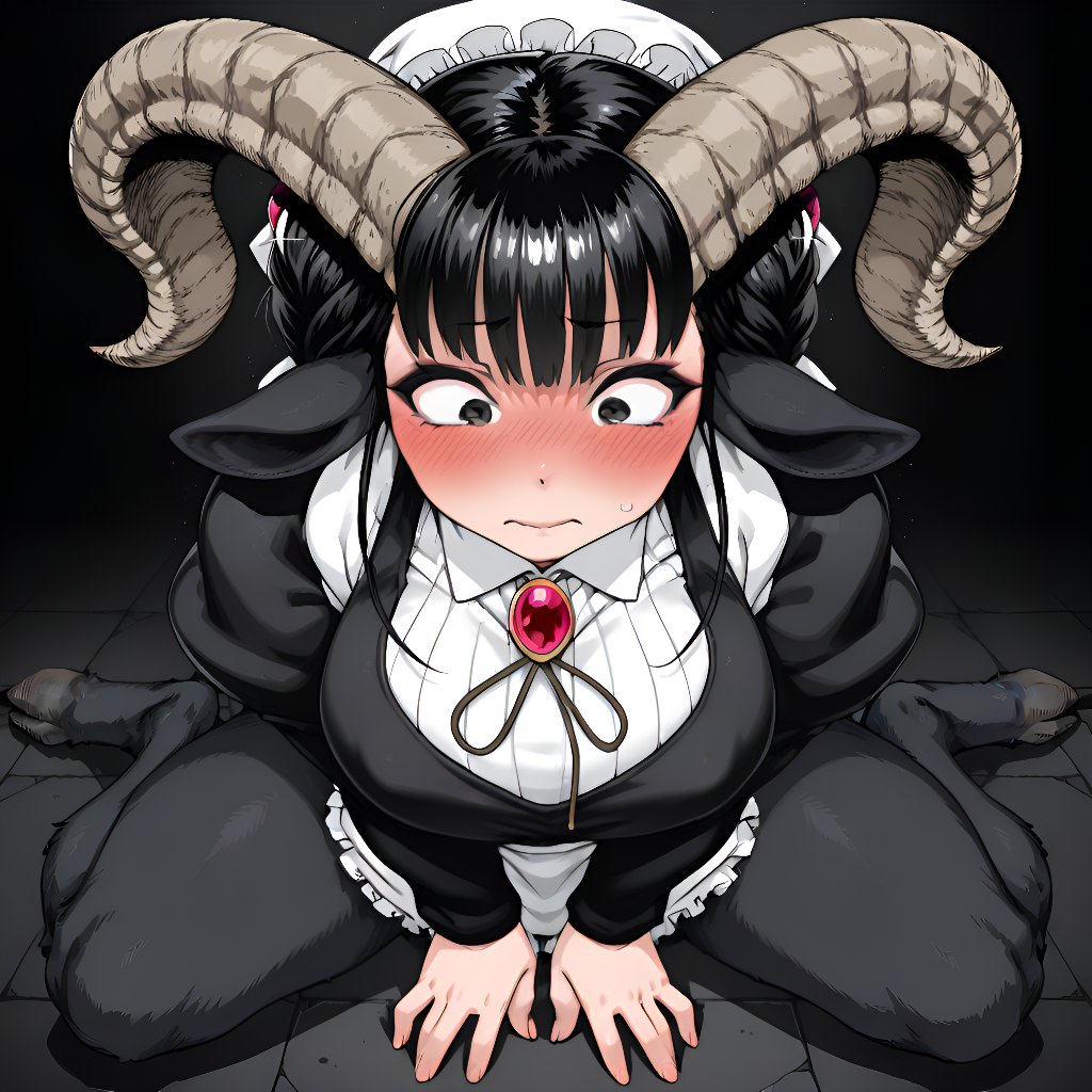 dgmaya、角、山羊娘、エプロン、黒髪、山羊の脚、金色の目