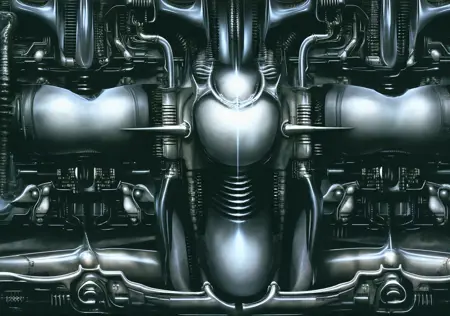 biomechanical, intricate, dark, surreal, mechanical, organic, eerie, structures