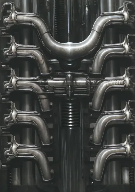 atmosphere, artwork, tubes, pipes, Giger, detailed, otherworldly, industrial, forms,