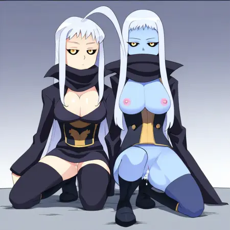 (Musume_Lala、長い髪、白い髪、黄色い目、色のついた鞄膜、アホ毛、青い肌、ブーツ、タイツ、スカーフ、ジャケット、ドレス、無頭部)