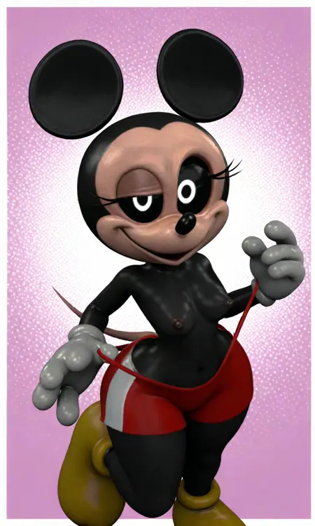 タグ: M1ickmick, 黒いボディ, 黒い躯体, 黒い sclera, 白い円形の瞳孔, ネズミの尾, 赤いショーツ, 白い手袋, 4本指, 黄色い靴, 黒い耳
