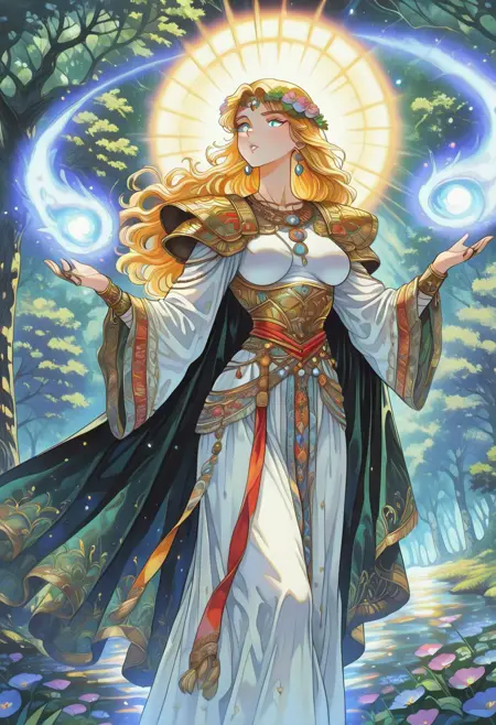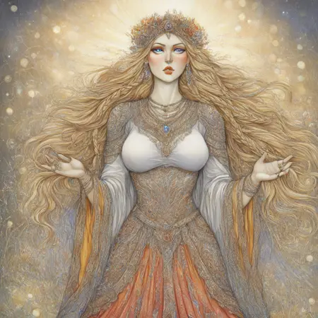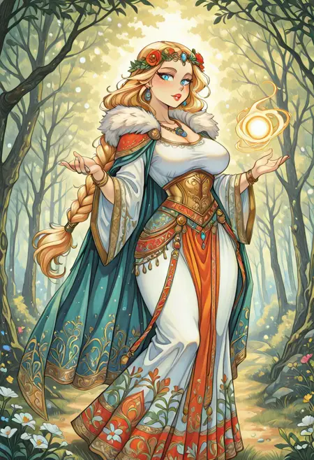 FantasySlavicMS,1个女孩,单独,丰满身材,白皙皮肤,非常长的头发,金发,发饰,头发花朵,头饰,单条辫子,凌乱的头发,耳环,蓝眼睛,丰满的嘴唇,妆容,大乳房,项链,长裙,宽袖,裙装装饰,手镯,粗大腿,珠宝,戒指,盔甲,珠子,毛皮镶边,宝石,斗篷,魔法,
