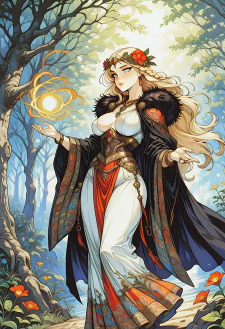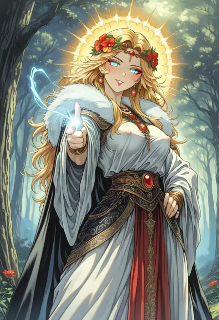 FantasySlavicMS, 1girl, solo, 곡선형 몸매, 창백한 피부, 매우 긴 머리카락, 금발, 머리 장식, 꽃 모양 머리장식, 머리띠, 단일 땋은 머리, 어지러운 머리카락, 귀걸이, 파란 눈, 두꺼운 입술, 메이크업, 큰 가슴, 목걸이, 긴 드레스, 넓은 소매, 드레스 장식, 팔찌, 두꺼운 허벅지, 보석, 반지, 갑옷, 비즈, 털 장식, 보석, 망토, 마법,