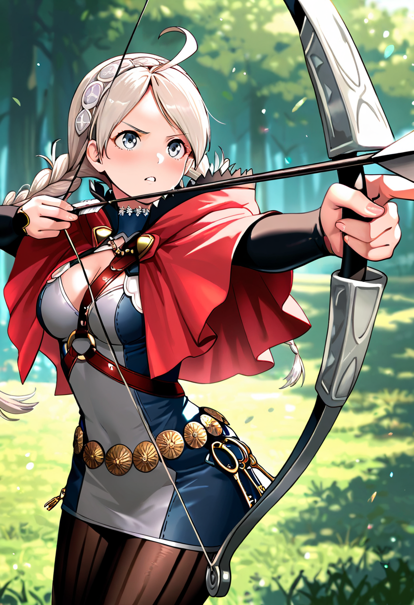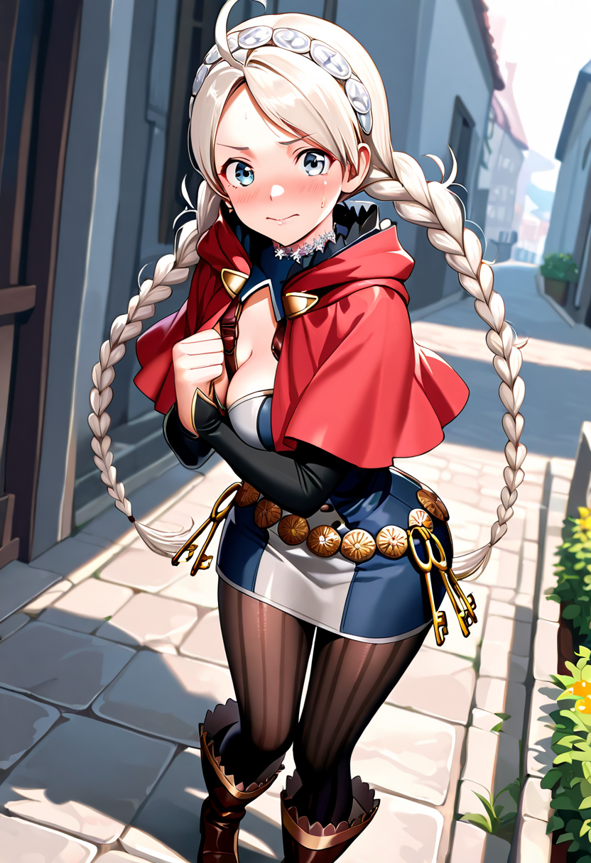 Trigger word : ninafe_il,capelet,hood_down,hooded_capelet,leather,chest harness, buttons,choker,belt,cleavage,key,o-ring,pantyhose,boots,