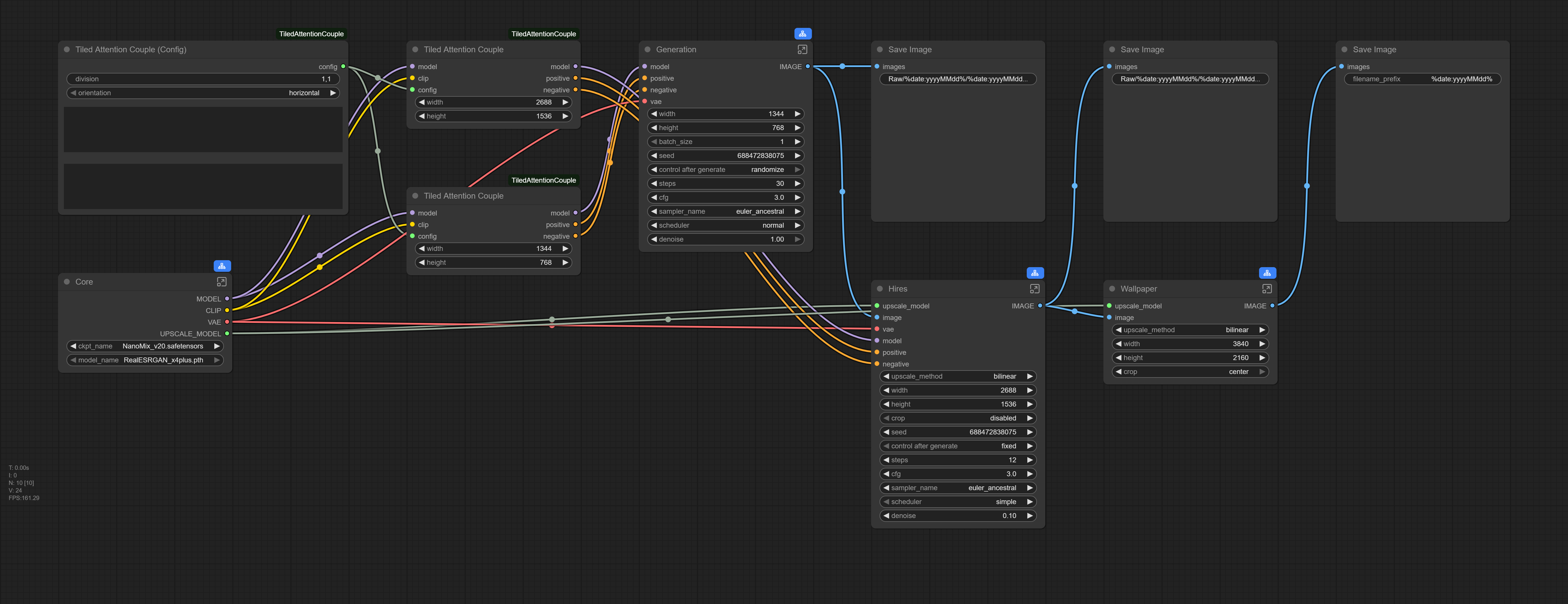 多角色工作流程 专为两个或更多角色设计,同时确保每个角色独立且提示准确。它使用了我的 Tiled Attention Couple 节点,并采用分组节点构建,尽可能保持整洁和用户友好。你可以从简单的双角色设置开始,然后扩展以支持三、四或更多角色。肖像请使用 Deathspike.Default.Tiled,壁纸请使用 Deathspike.Wallpaper.Tiled。
