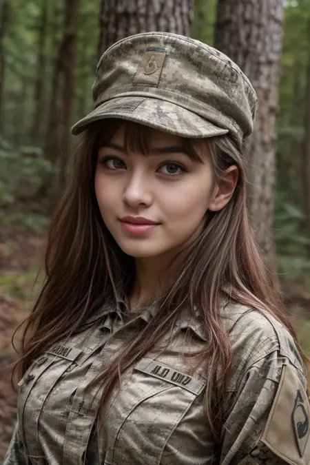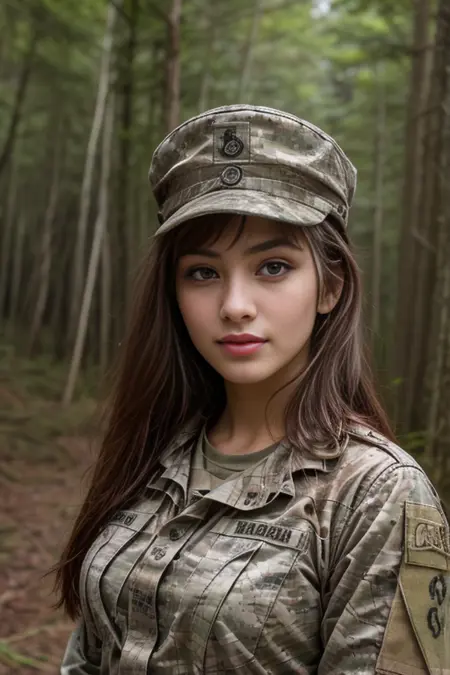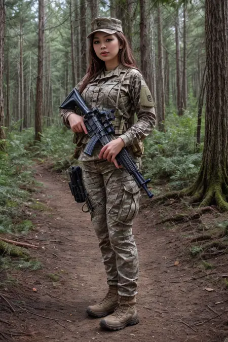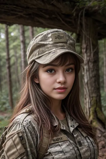 트리거 단어 = 군용 캠oufl라지 유니폼, 셔츠, 바지, 모자, 소총, 숲, 캠프