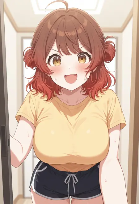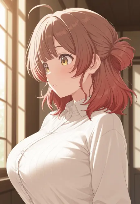 large breasts, gradient hair, red hair, brown hair, bangs, ahoge, single hair bun, hair bun, yellow eyes, brown eyes, medium hair, umehanami
