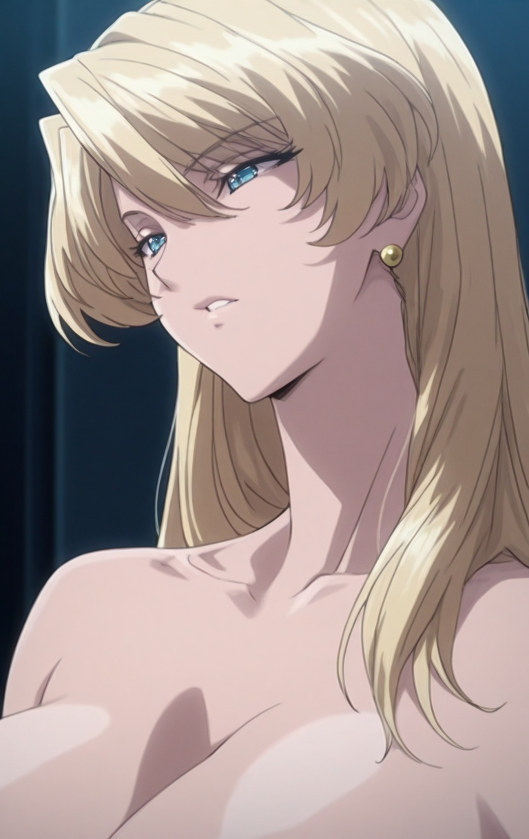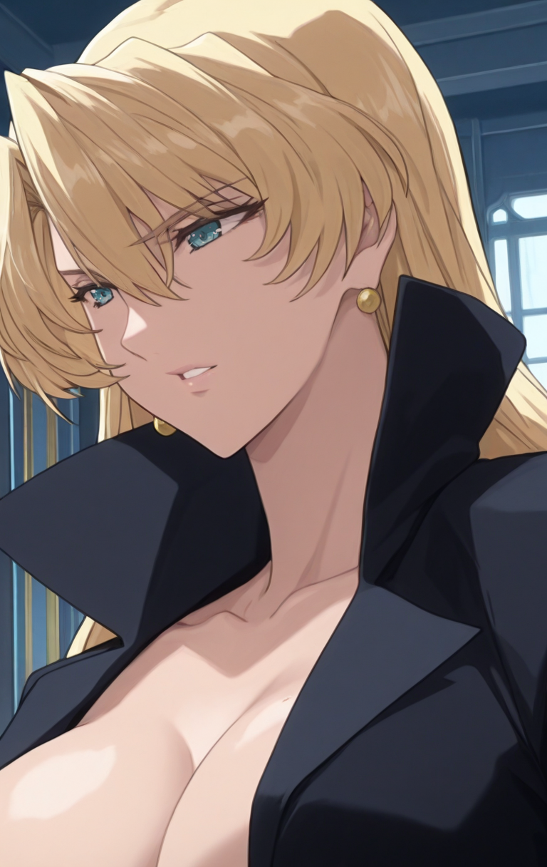 1girl, solo, looking at viewer, blue eyes, blonde hair, jewelry, jacket, earrings, parted lips, indoors, black jacket, no bra, single hair bun, gem, black jacket,sp4c3x,