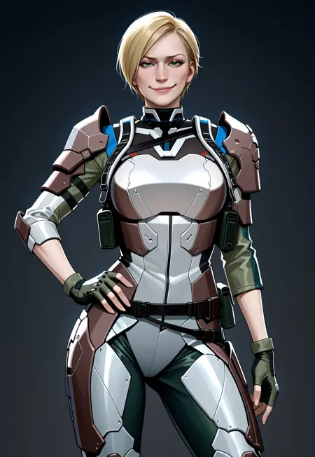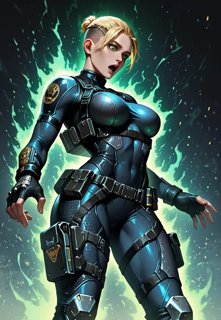 군용 바디수트, 보디아머, 어깨아머, 다리아머, 벨트, 어깨 홀스터, 녹색 장갑, 핑거레스 장갑, 부츠,