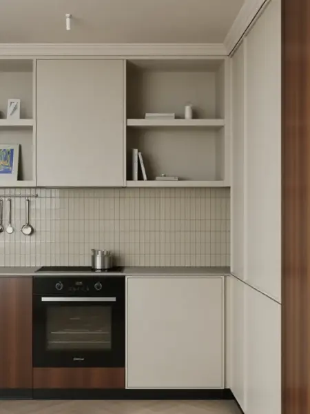 WD,这张照片展示了一间现代极简风格的客厅与厨房一体化空间。客厅区域摆放着浅蓝色丝绒沙发,配有两个绿白相间图案的靠垫,前方是米色墙壁,墙内嵌有置物架。厨房区域采用流线型米色橱柜和不锈钢烤箱,后挡板为白色亚光瓷砖,水槽上方悬挂着一盏小巧的现代吊灯。整个空间由嵌入式顶灯充分照明。