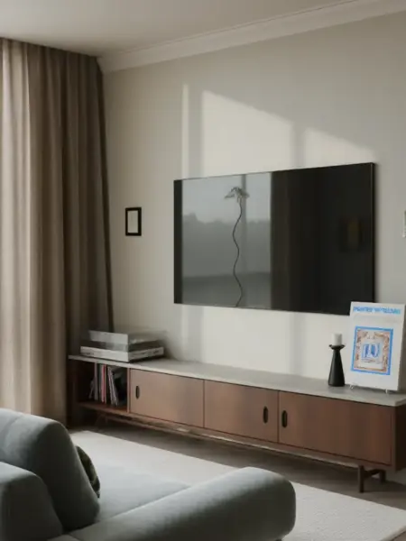 WD,这张照片展示了一间现代极简风格的客厅,大型平板电视安装在浅灰色墙壁上。电视下方是一组线条流畅的木质柜子,配有黑色把手,柜上摆放着一盏黑色台灯、一幅装框照片和一本名为《Camerata》的书。前景处是一张灰蓝色绒面沙发,铺在浅灰色地毯上。左侧,米色窗帘半掩窗户,柜子上方悬挂着一幅小型装框艺术品。整体装饰现代而优雅。