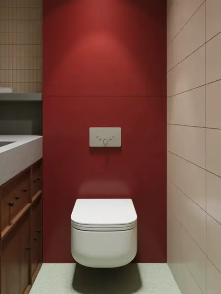 WD,这张照片呈现了一间极简现代卧室,色调宁静。深色木质 dresser 靠在浅灰色墙壁上,配有简单圆形把手。柜顶摆放着一个黑色花瓶,内插几束高耸的干麦穗,一盏现代小台灯(灰色底座)以及一个矩形棕褐色物体。墙上悬挂一幅大型抽象画,以白色和栗红色为主调。地板为浅色木地板,前景椅上搭着一条绿色毯子。整体风格干净宁静。