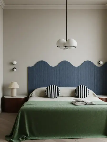 WD,这是一张现代极简风格客厅的照片。空间内设有一张浅灰色沙发,配有两个黑白条纹靠垫。沙发后方的搁架上摆放着一盏小台灯、书籍和装饰品。沙发前方是一张蓝色圆形边桌,桌面带有花卉图案。墙面为浅灰色,沙发上方悬挂一幅大型抽象蓝色画作。天花板上装有几何造型吊灯。