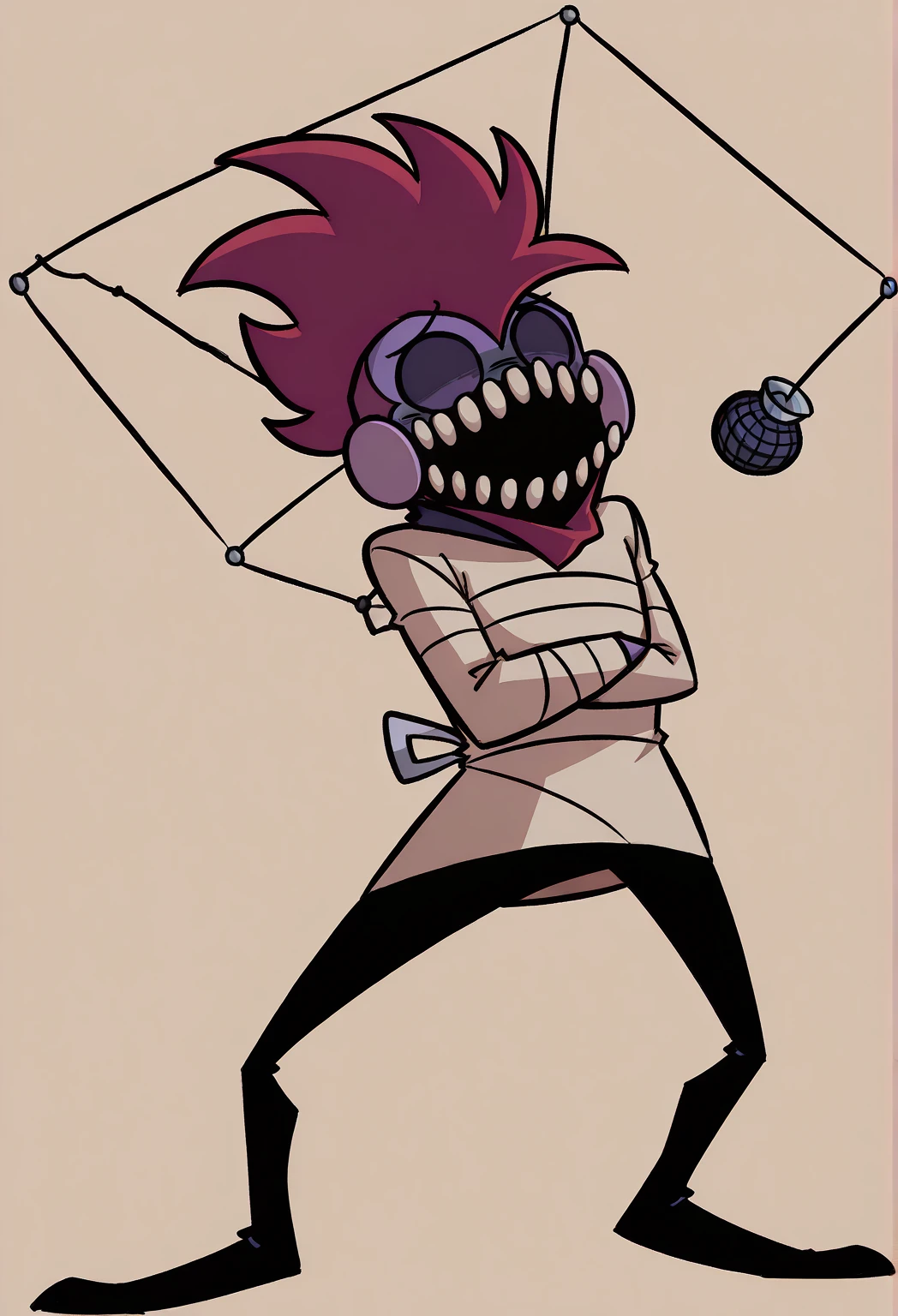 Zi1perFNF, 1boy, bipedal, beige straitjacket, light purple skin, red mohawk, pinkish cheeks, large round teeth on face, spindly black legs, stilt-like mechanism