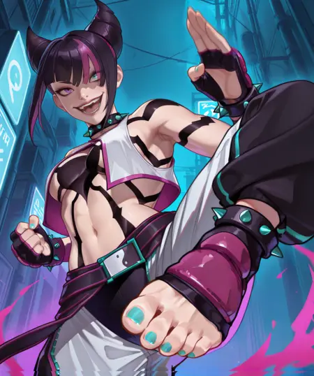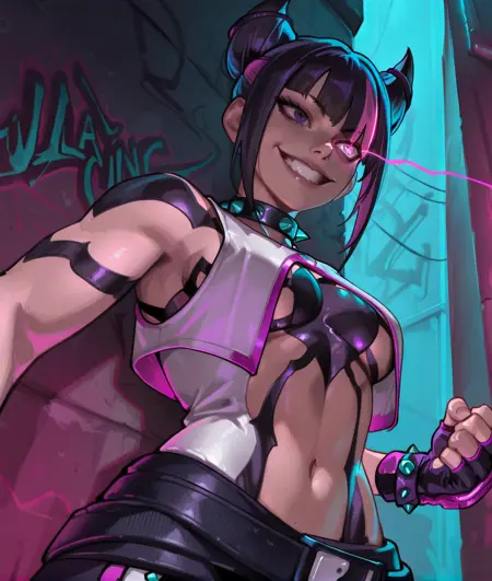 Juri , black hair,two-tone hair, hair horns, purple eyes, eyepatch,