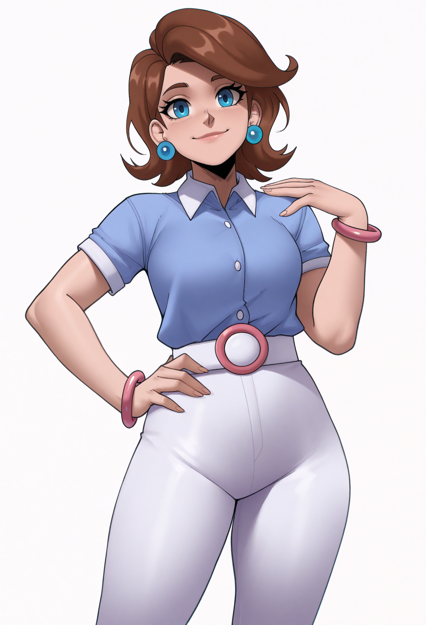 衣装タグ:イヤリング、青いシャツ、ポロシャツ、短い袖、ピンクのブレスレット、白いベルト、白いズボン