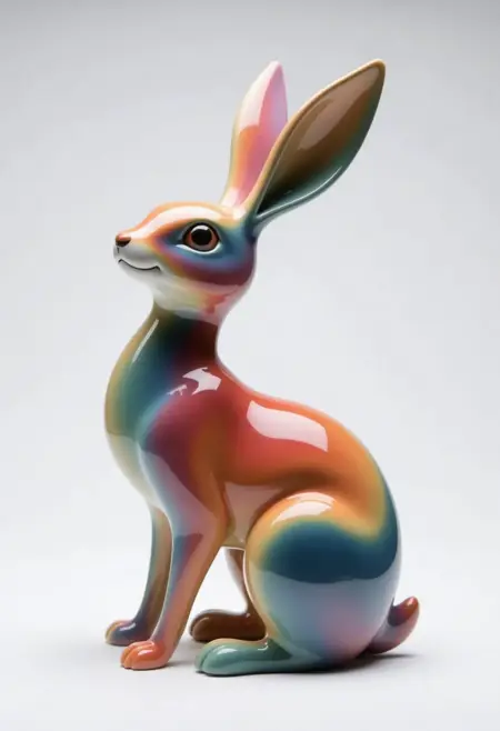 Colorful animal sculptures with smooth curves, a playful rabbit, gentle color gradation, matte surface, cute stance.