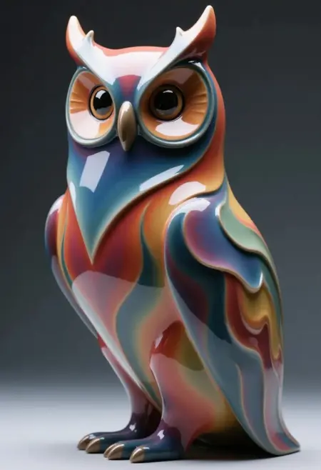 Colorful animal sculptures with smooth curves, a mysterious owl, dark color shades, glossy eyes, wise posture.