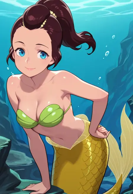 外見: 茶色の髪、ポニーテール、青い目、中くらいの胸、モンスターガール、人魚、黄色い尾、ウロコ
