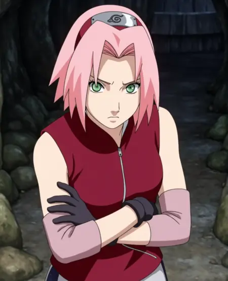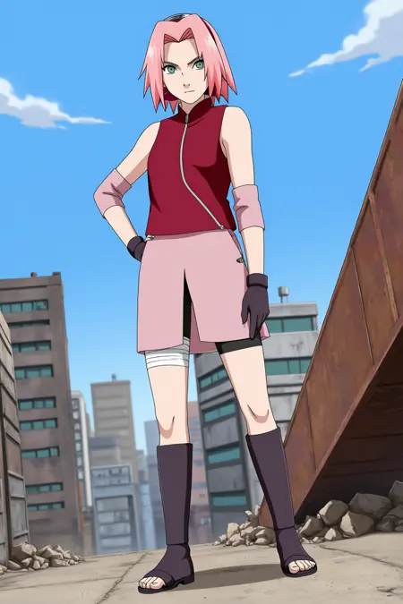 태그: 사쿠라 하루노, 단발의 분홍색 머리에 코나하가쿠레 상징이 있는 빨간 헤드밴드를 착용, 녹색 눈, 빨간 민소매 셔츠, 분홍색 팔꿈치 보호대, 검은 장갑 착용, 분홍색 치마, 치마 아래에 검은 자전거 반바지 착용, 왼쪽 다리는 붕대 감김과 홀스터 착용, 발가락이 드러난 부츠 착용