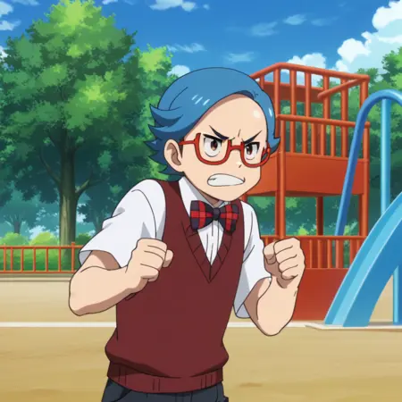 提示:男性,蓝色头发,多色眼睛,棕色眼睛,红色眼睛,眼镜,白大褂,领结,白衬衫,针织背心,长裤,棕色便鞋,室内(书店/书架/书籍/柜台/显示器/绘画(物体)),室外(城市/天空/建筑/街道/斑马线/交通灯/灌木/树/汽车/卡车),室外(公园/蓝天/云朵/房屋/树/栏杆/攀爬架/滑梯),全息界面