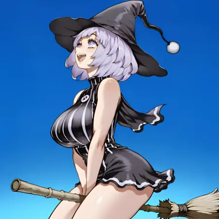 wmojikawa, 마녀 모자, 보라색 눈, 연한 보라색 머리카락, 큰 가슴, 청소용 빗자루
