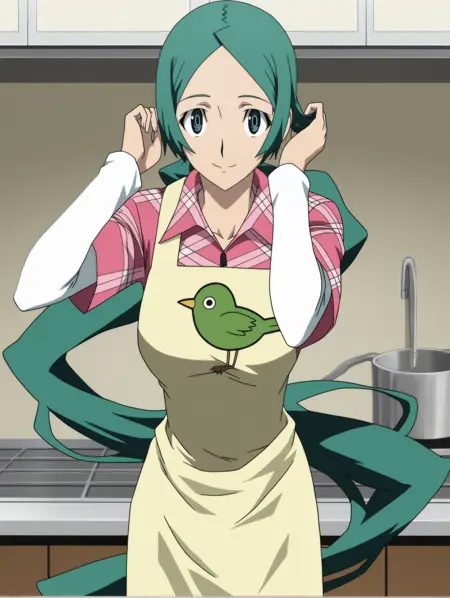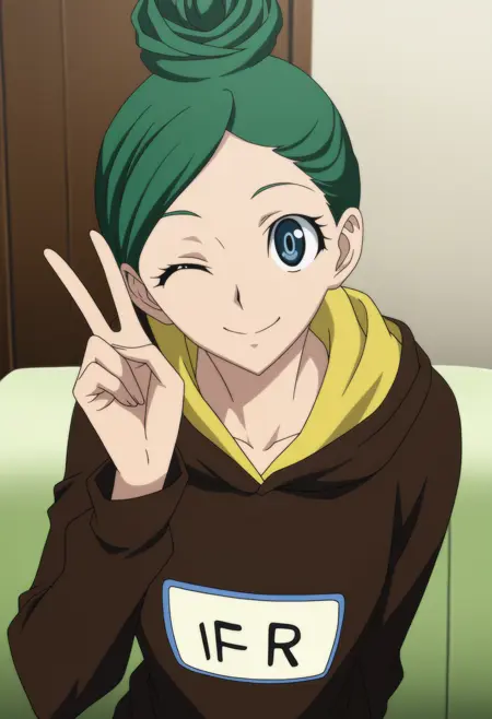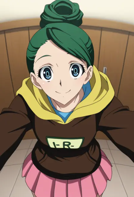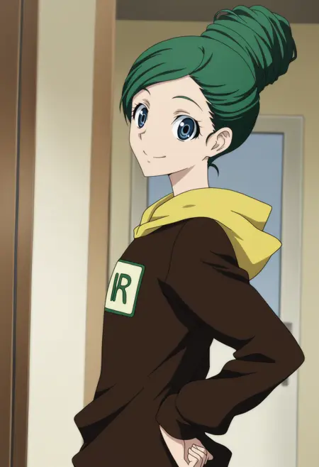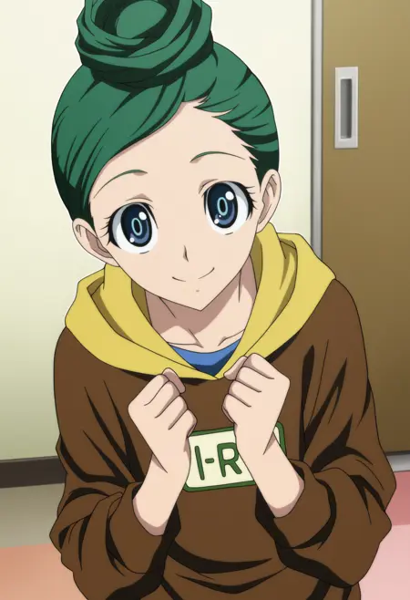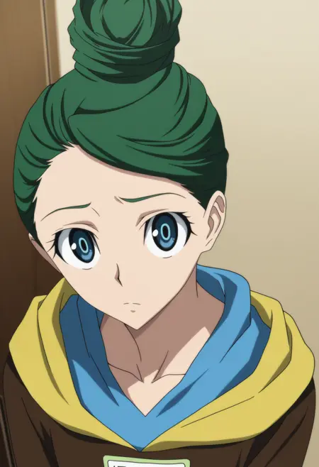 IL_Midori Kunihiro,1girl,solo,green hair,blue eyes,hair bun,single hair bun