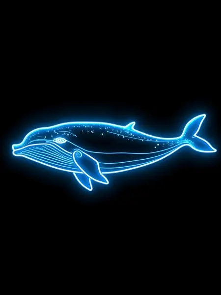 Neon light effect,构建一只巨大的鲸鱼,霓虹线条描绘其流线型身躯,蓝绿色调,宛如在深海中游弋。