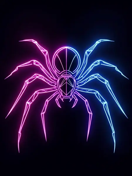 Neon light effect,形成一只吓人的蜘蛛,霓虹灯光编织其网与身体,紫蓝色光晕,带有危险感。