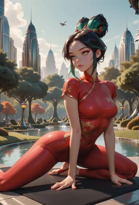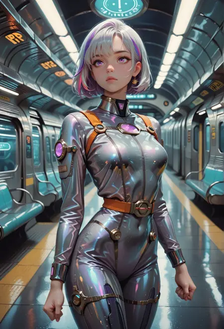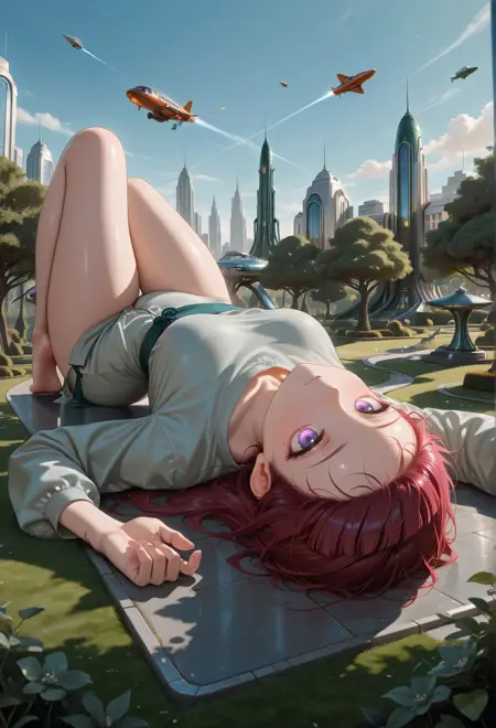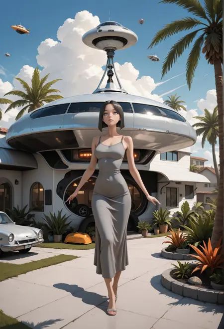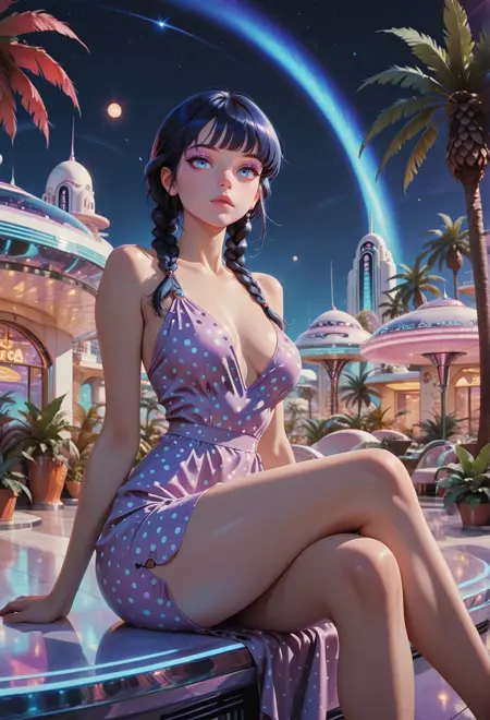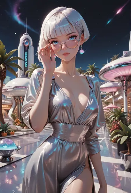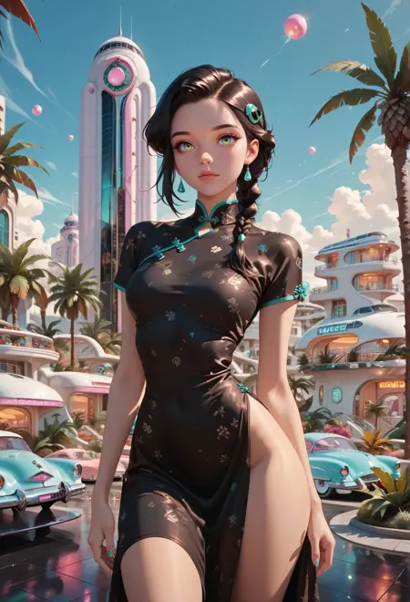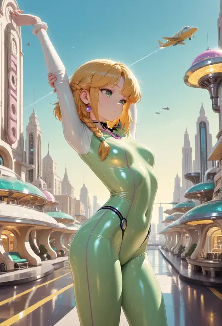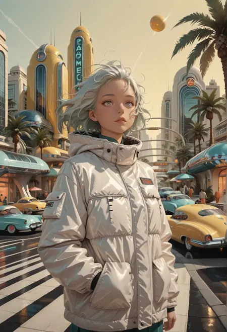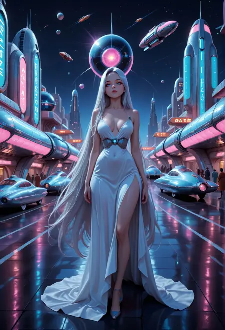 이 LoRA는 유토피아적인 사이버펑크 분위기를 장면에 부여하는 데 탁월합니다. 깨끗한 도시 풍경, 반사되는 금속, 파스텔 톤의 하늘, 우아한 중기 디자인 형상 등이 특징입니다.