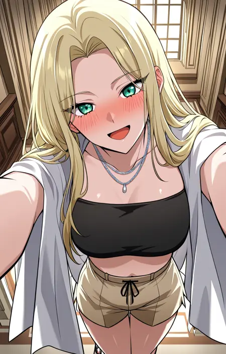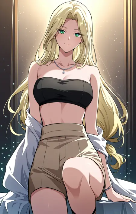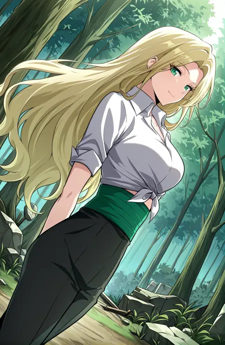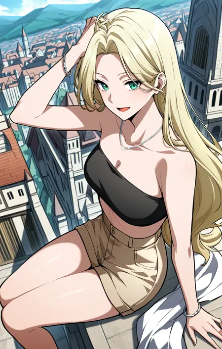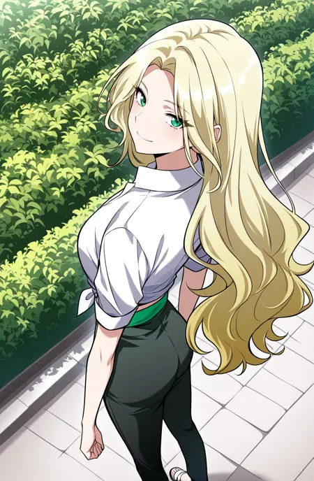 Tes, 1명의 소녀, 싱글, 긴 머리, 금발 머리, 높은 포니테일, 측면 머리카락, 측면 스윕 앞머리, 녹색 눈,