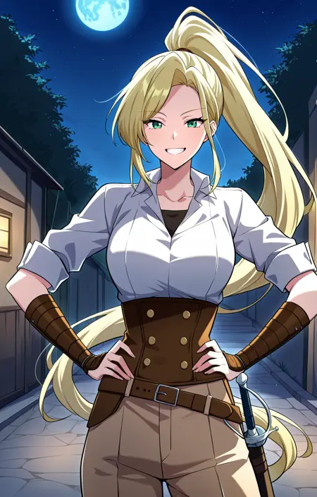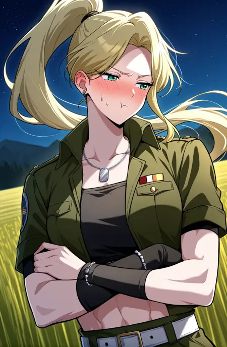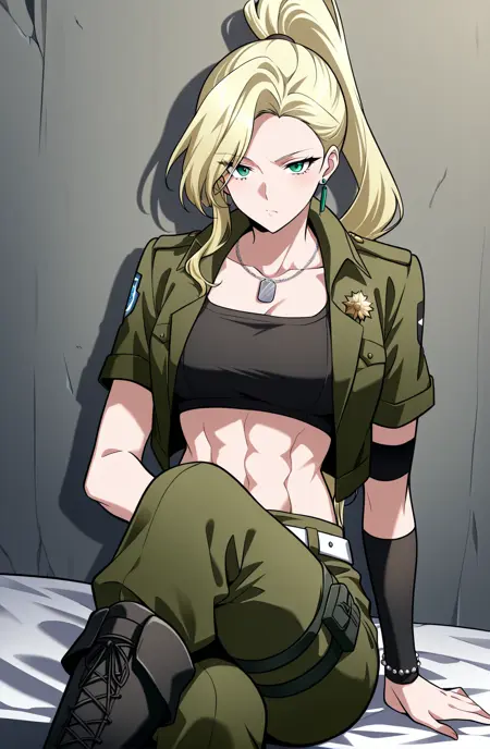 Tes, 1명의 소녀, 싱글, 금발 머리, 긴 머리, 높은 포니테일, 측면 스윕 앞머리, 녹색 눈, 근육질, 귀걸이,