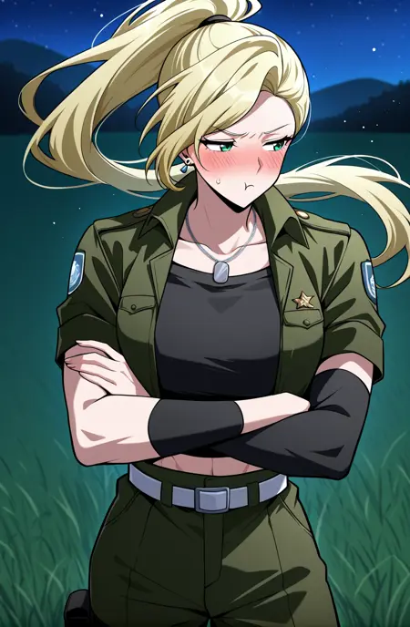 Tes_outfit1, 군복, 열린 녹색 재킷, 검은 크롭 탑, 녹색 카고 팬츠, 흰색 벨트, 허벅지 스트랩, 검은 팔보호대(왼쪽 팔), 검은 부츠, 도그 태그 목걸이, 군사 배지, 검은 코드 목걸이, 실버 찰스 팔찌,