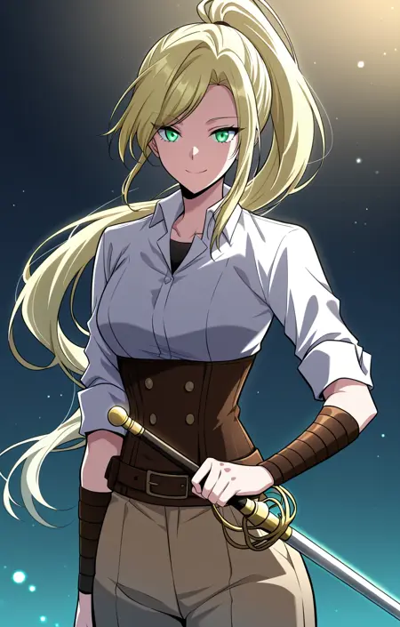 Tes_outfit, 흰색 칼라 셔츠, 접은 소매, 갈색 코르셋, 더블브레스트 코르셋, 갈색 팬츠, 갈색 벨트, 검은 언더셔츠, 갈색 팔보호대, 검은 칼, 래피어,