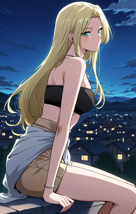 Tes_outfit3, 검은 밴도 상의, 톤 색 고웨이스트 반바지, 매듭 지은 흰색 천, 한쪽 샌들, 발목 스트랩 샌들, 실버 팔찌, 실버 목걸이,