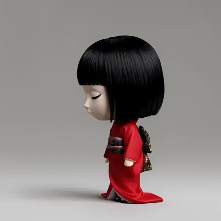1girl, solo, short_hair, black_hair, long_sleeves, standing, full_body, japanese_clothes, kimono, chibi, sash, bob_cut, obi, red_kimono, traditional_youkai, Japanese traditional doll, closed eyes,