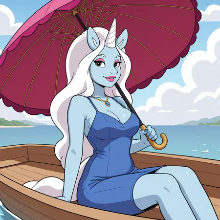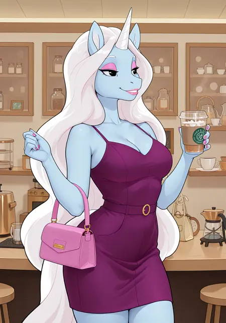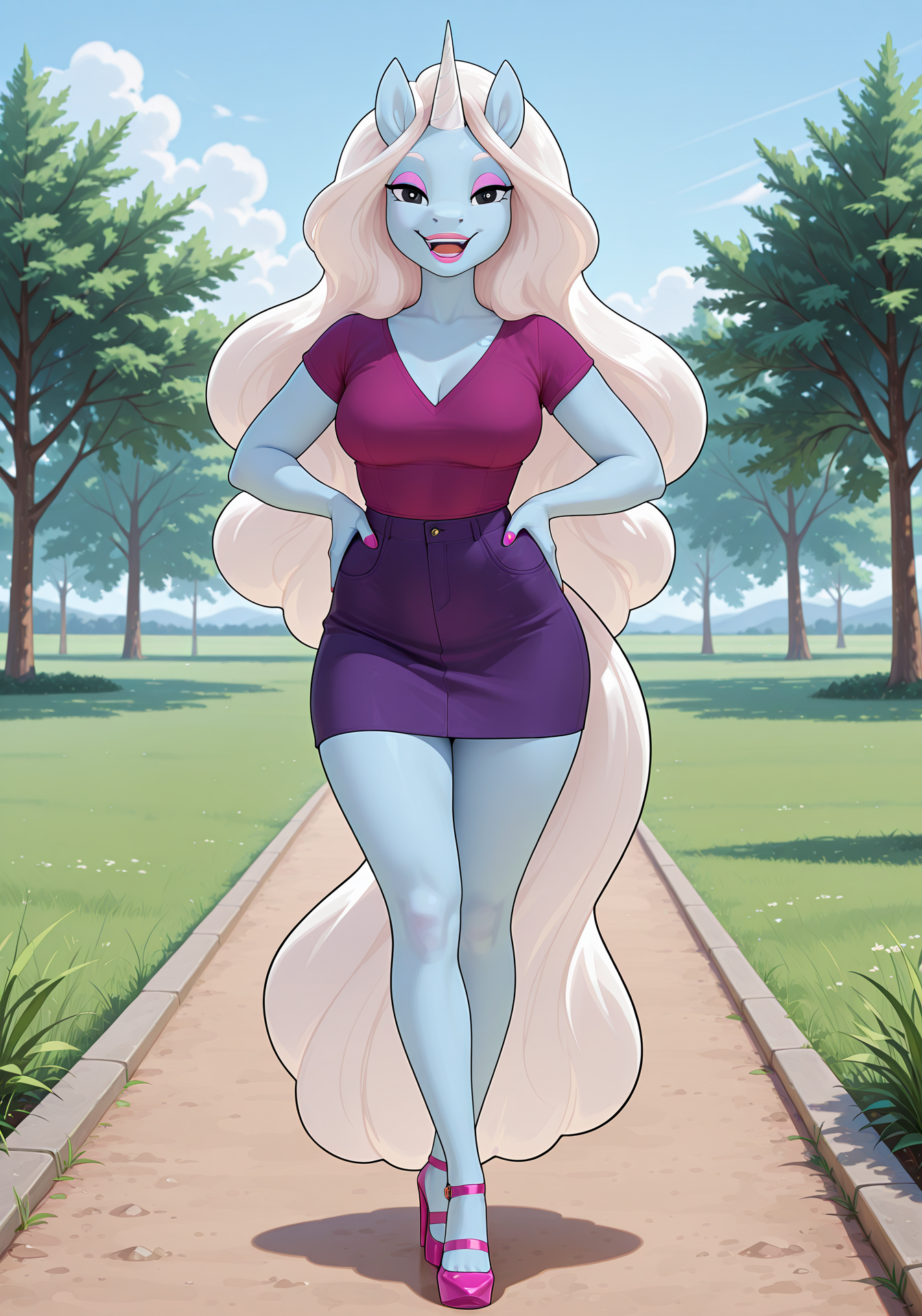 glowtheunicorn, single horn, white hair, very long hair, colored skin, blue skin, animal ears, makeup